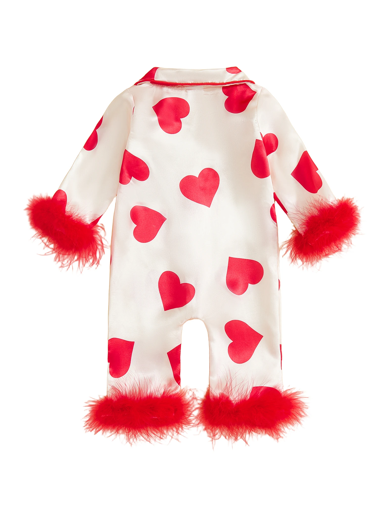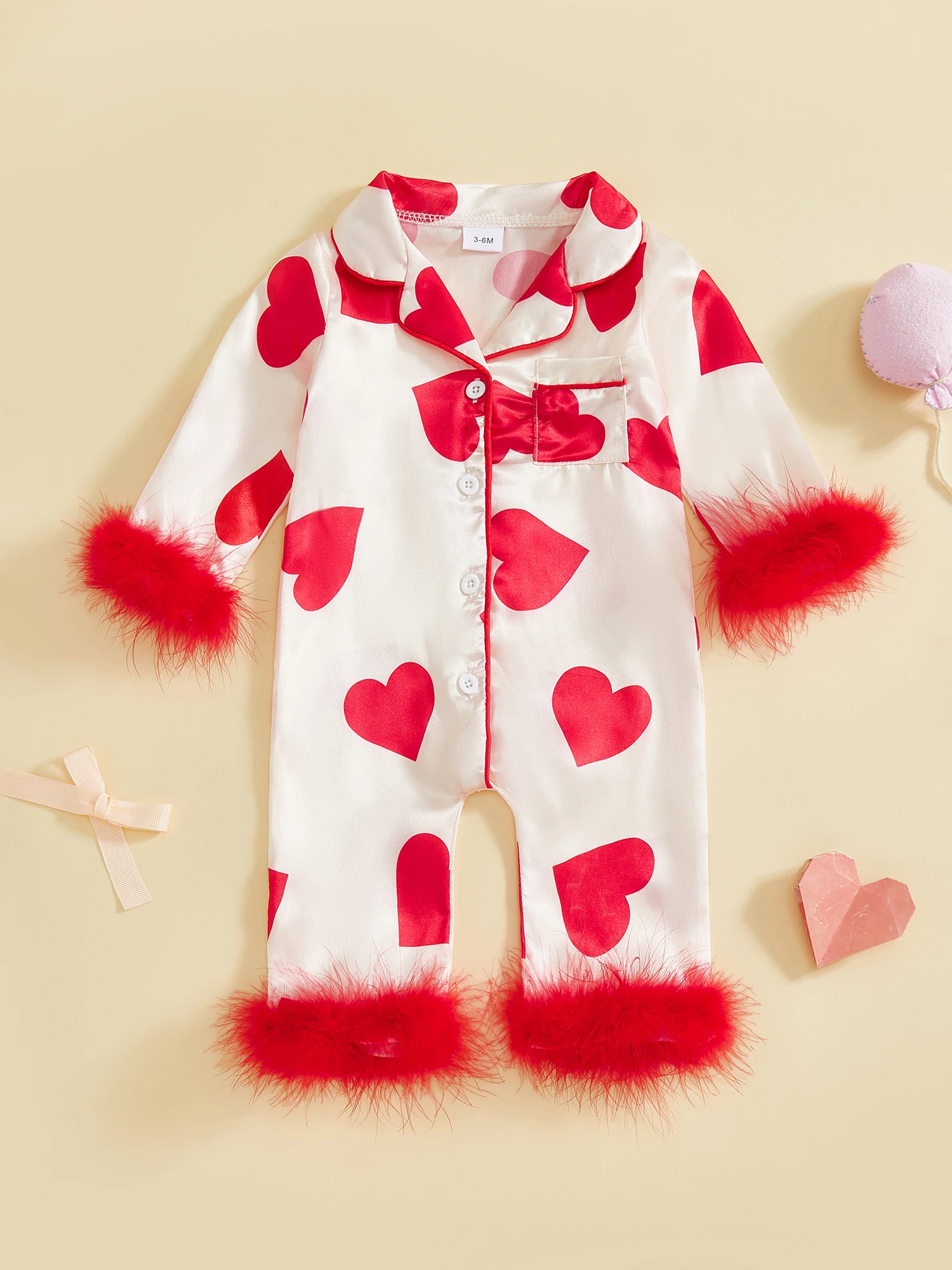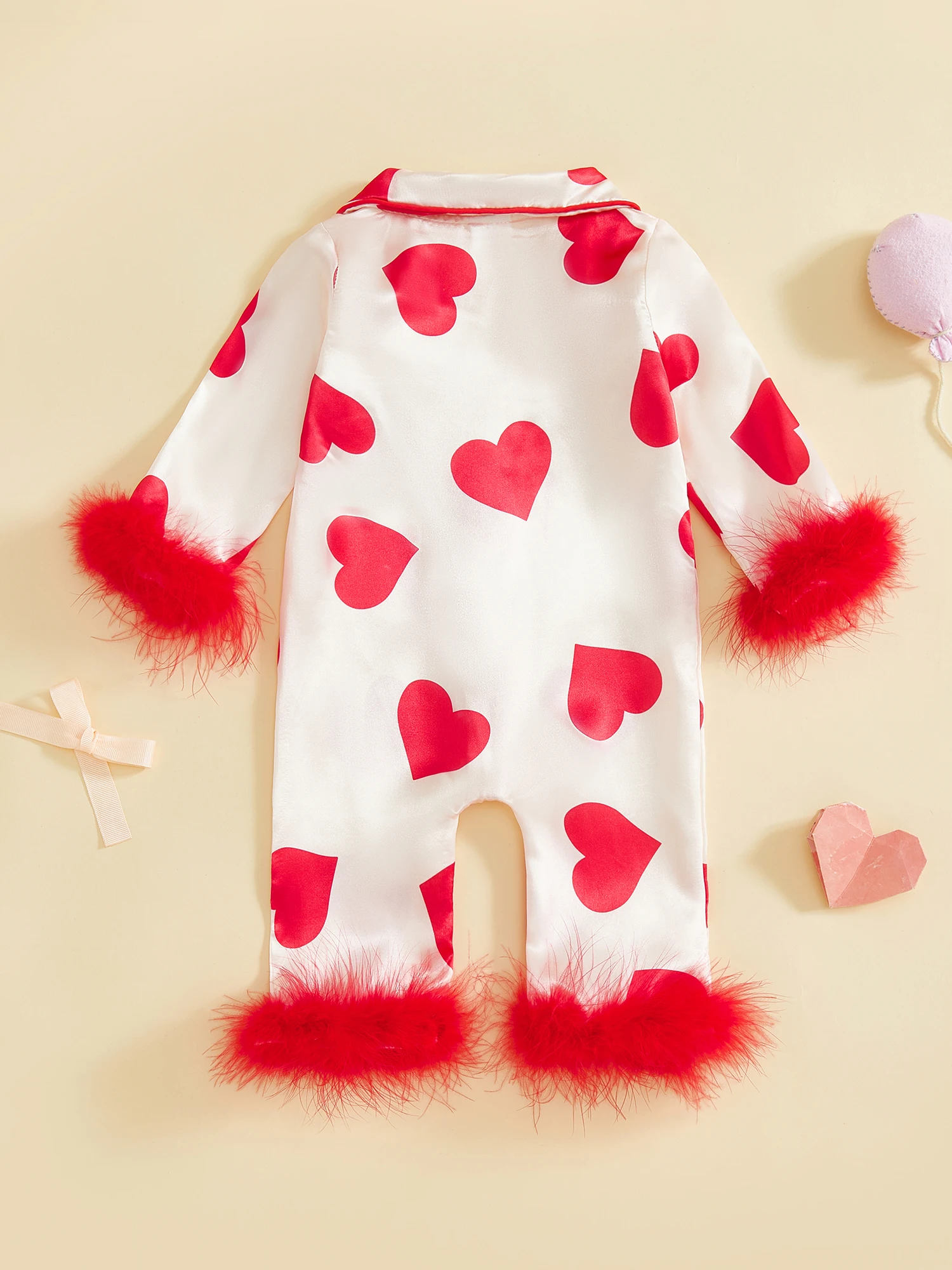 Baby Girl Romper Long Sleeve Lapel Collar Heart Print Jumpsuit Pajamas