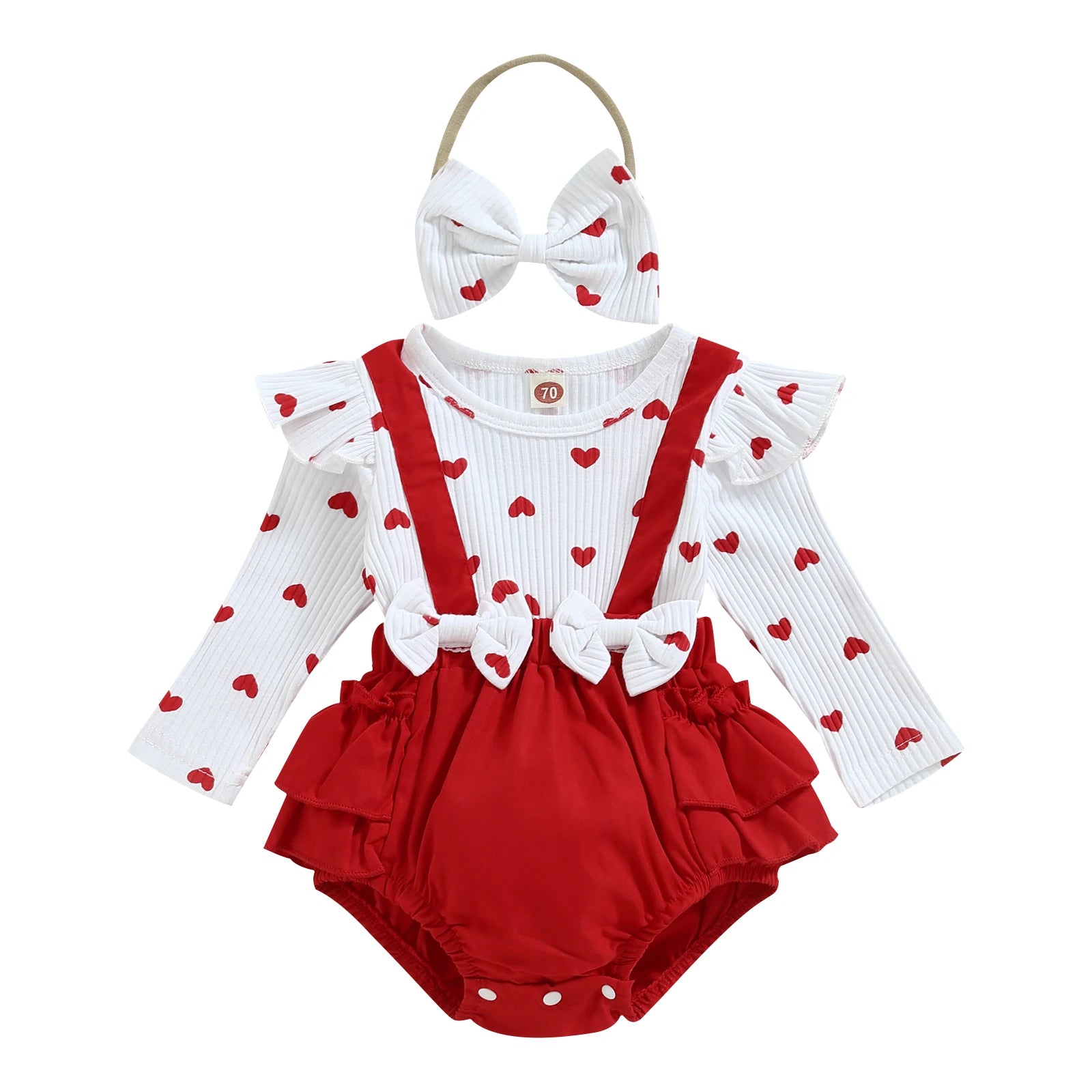 Valentine's Day Infant Baby Girls Romper Heart Print Long Fly Sleeve Crew Neck Ruffles Jumpsuits Baby Jumpsuit with Bow Headband